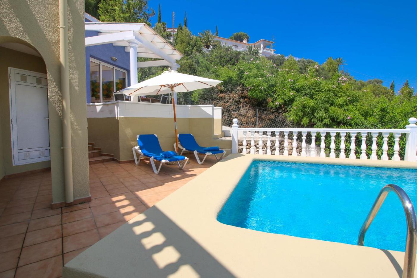 Guests can enjoy the outdoor swimming pool and garden at the villa.